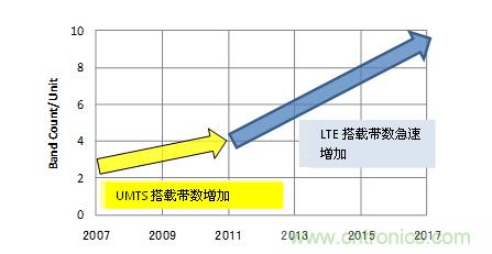 3G技術只是一種上行和下行達到數(shù)Mbps程度的速度,但是LTE卻以上行50Mbps以上,下行100Mbps以上的速度,達到了與固定通信網(wǎng)絡速度相同的目標。GSM/UMTS對應終端中,通常都是GSM搭載4個,UMTS搭載2-4個頻帶,如果要對應LTE的話還會再追加1-2個頻帶。圖1是移動設備中搭載的平均頻帶數(shù)的推測圖。網(wǎng)絡上的通信量增大的同時,保證了通信容量、通信頻率,LTE頻帶的搭載數(shù)量預測也將迅速增加。