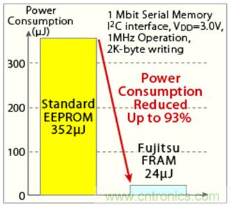圖3:EEPROM和富士通半導(dǎo)體FRAM產(chǎn)品之?dāng)?shù)據(jù)寫入作業(yè)功耗比較