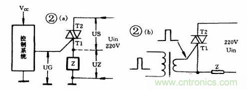 觸發(fā)電路設(shè)計(jì)不當(dāng)?shù)牡诙€(gè)例子常見于電子制作稿中,其電路見圖2a, 圖中對電路進(jìn)行簡化。其實(shí), 無論控制系統(tǒng)完成何種控制,無論是單向還是雙向可控硅, 圖2的觸發(fā)電路是不能正常工作的。其問題在于,控制系統(tǒng)發(fā)出觸發(fā)信號(hào)UG,其參考點(diǎn)是共地,而可控硅T1或T2的參考點(diǎn)是負(fù)載熱端。實(shí)際上, 加到可控硅的觸發(fā)電壓UG是與負(fù)載端電壓UZ相串聯(lián)的。雙向可控硅究竟是T1還是T2為觸發(fā)參考點(diǎn),視觸發(fā)信號(hào)的相對極性來決定的。如按圖2中標(biāo)注,T1在下,T2在上, 則UG相對于T1必須是正極性的, 且與T1的電壓同參考電位。但無論T1還是T2作參考點(diǎn), 按圖2a的接法,可控硅導(dǎo)通時(shí),UZ常近似等于Uin,如此高電壓加到觸發(fā)極G和T1之間, 將立即使觸發(fā)極被擊穿,可控硅被損壞。