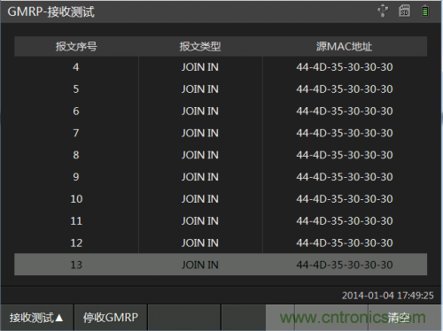 GMRP模塊在DT6000E設(shè)備總共分為注冊、發(fā)送測試和接收測試頁面。
