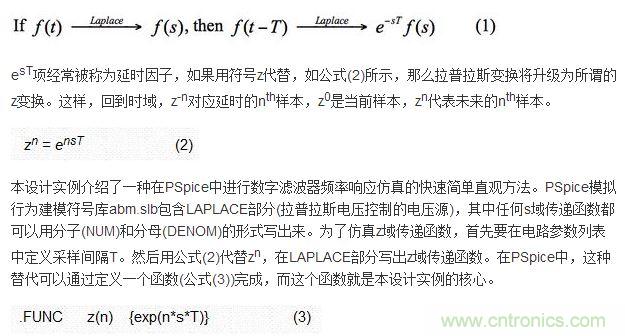 通常拉普拉斯變換用于模擬電路的行為建模,因為它將時域變換成為復頻率s域。數(shù)字濾波器的頻率響應(yīng)作為一個特殊例子,可以從拉普拉斯變換的時移理論(延時理論)推導出來。該理論表示,如果時間函數(shù)f(t)在時域中被延時了時間T,那么在頻域中的結(jié)果要乘以e-sT,見公式(1)。