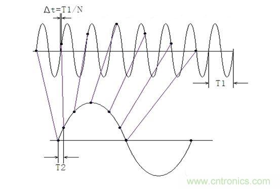 可以看到,等效采樣方法在輸入信號一個(gè)周期內(nèi)僅采樣一個(gè)點(diǎn)且每個(gè)周期采樣的相位有遞增關(guān)系(圖1中△t),調(diào)整這個(gè)遞增相位可以達(dá)到調(diào)整相位分辨率的目的。