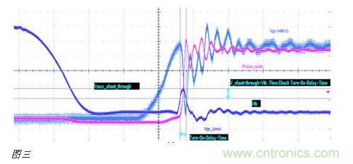 測(cè)試的目的是看上MOS管導(dǎo)通時(shí),有沒(méi)有同時(shí)把下管打開(kāi),從而導(dǎo)致電源直接導(dǎo)通到地而引起短路。如圖三所示藍(lán)色曲線(Vgs_Lmos)就是下管在上管導(dǎo)通的同時(shí),被帶了起來(lái),如果藍(lán)色曲線的被帶起來(lái)的尖峰超過(guò)了MOS管的Vth要求,同時(shí)持續(xù)時(shí)間(Duration)也超過(guò)了datasheet要求,從而就會(huì)有同時(shí)導(dǎo)通的風(fēng)險(xiǎn)。當(dāng)然,這是大家最常見(jiàn)到的情況。