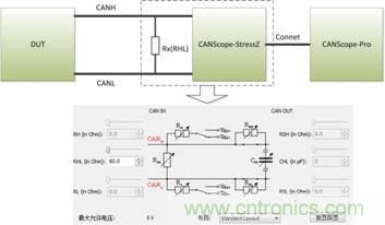 由此可見,該方法雖然可以大致測量出CAN節(jié)點的差分電平位信號特征,但由于其用于做分析的樣本很少,測量方式有很難操作,所以為了提高測量結果的準確度,減低人工成本,文章中對測試方法進行了改進,使用CANScope-Pro總線分析儀、CANScope-StressZ擴展板,使用配套軟件的樣眼圖與對稱性測試進行測量。