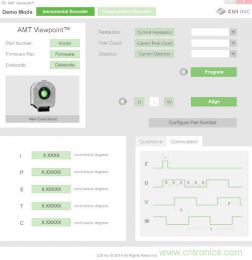 在演示模式,用戶能夠使用GUI,以及進(jìn)行編碼器相關(guān)運(yùn)作,就像連接實(shí)際的編碼器一樣,這是在購買或?qū)嶋H使用之前熟悉編碼器和工具的便利方法。最終,GUI還支持創(chuàng)建可定購的部件編號(hào),用于特定的編碼器型款,這包括輸出格式、套(孔)適配器,以及安裝基座等選項(xiàng)。