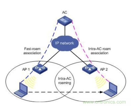 AC內(nèi)漫游(Intra-AC roaming):一個無線終端從AC的一個AP漫游到同一個AC內(nèi)的另一個AP中,即稱為AC內(nèi)漫游。如圖1所示。