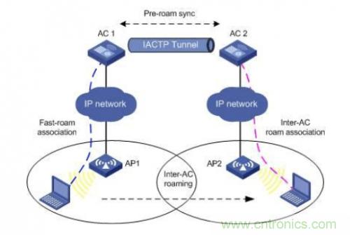 AC間漫游(Inter-AC roaming):一個無線終端從AC的AP漫游到另一個AC內(nèi)的AP中,即稱為AC間漫游。如圖2所示。