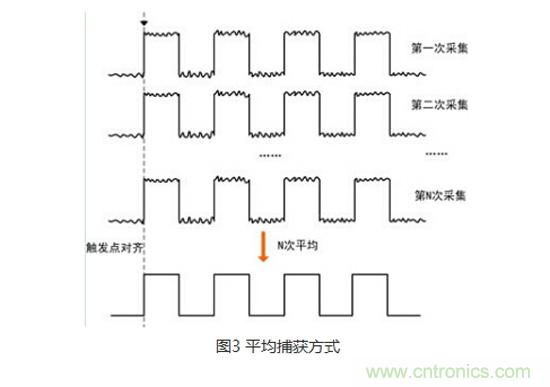 第三個就是平均捕獲模式了,這個名字也非常容易理解,就是采集N屏信號,將它們在觸發(fā)位置對其,然后做平均運算。