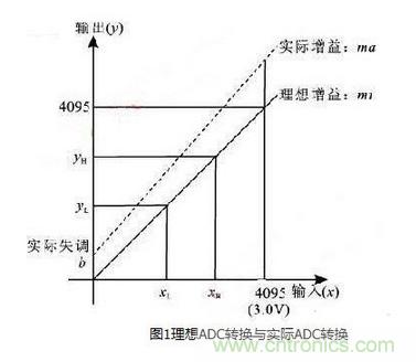 對于雙極性輸入,其0 V輸入的增益誤差對應(yīng)單極性輸入的1.4315V的增益誤差,因此,原有ADC的增益誤差和失調(diào)誤差被增大了。例如,如果ADC的增益誤差為5%,失調(diào)誤差為2%,則其雙極性的增益誤差計(jì)算如下:雙極性輸入x′= 0.0000 V,單極性的ADC輸入電壓x = 1.4315 V,其理想的轉(zhuǎn)換值為ye=1.4315×4095/3=1954,而由ya=1954×1.05+80計(jì)算得實(shí)際轉(zhuǎn)換值,則雙極性增益誤差為ya-ye=2132-1954=178(9.1%誤差)。通過計(jì)算可以看出,ADC的誤差大大增加,因此要使用ADC進(jìn)行數(shù)據(jù)采集,就必須對ADC進(jìn)行校正,提高其轉(zhuǎn)換精度。