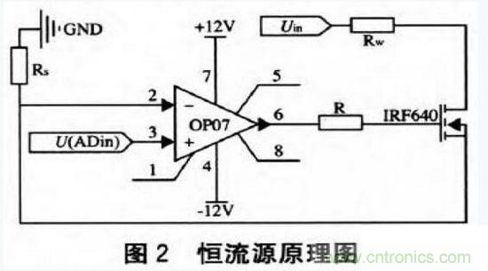 通過16位高精度模數(shù)轉換器ADSlll5輸出電壓給恒流源電壓轉換恒定電流電路,由于運算放大器OP07是精度高、低漂移運算放大器,并且在10歐負載的情況下輸出電流能達到2 A。所以采用OP07和IRF640組成的一個Uin。電流串聯(lián)負反饋來實現(xiàn)電壓到電流的轉換,具體電路如圖2所示。