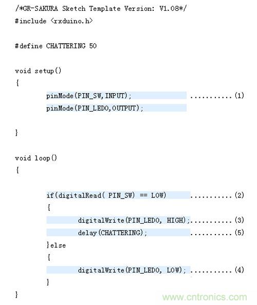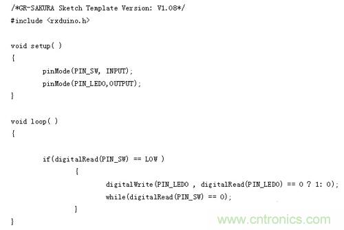 由于這次使用的是GR-SAKURA電路板上的開關(guān)和LED,所以即使不知道與其相連的引腳號(hào)和端口號(hào),如為開關(guān),只需在程序中寫入“PIN_SW”,如為L(zhǎng)ED,只需在程序中寫入“PIN_LED0”?“PIN_LED3”,櫻花程序庫(kù)(SAKURA Library)就會(huì)進(jìn)行處理。