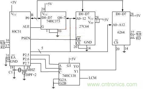 在80C51單片機中,外部I/O口是作為外部RAM來擴(kuò)展的,選址的方法與擴(kuò)充外部RAM的方法完全相同。本電路除了外部的RAM外,還有LCD顯示器作為外部I/O器件,因此,只采用線選址方式是不夠的,應(yīng)采用譯碼選址方式。