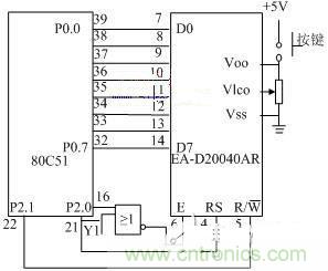 LCM點陣式液晶顯示模塊能顯示的字符多,并且能顯示漢字,因而在智能化測量控制儀表中得到了廣泛的應(yīng)用。本系統(tǒng)選用的是EPSON公司生產(chǎn)的EA-D20040AR點陣式液晶顯示模塊,它由TN型液晶顯示器、CMOS驅(qū)動器和CMOS控制器組成,模塊內(nèi)集成有字符發(fā)生器和數(shù)據(jù)存貯器,采用單±5V電源供電,內(nèi)部有能顯示96個ASCII字符和92個特殊字符的字庫。EA-D20040AR與單片機80C51的接口電路如圖4所示: