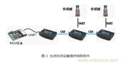 我們都知道CAN總線是一種多主總線,可以實(shí)現(xiàn)多節(jié)點(diǎn)組網(wǎng)通訊,自帶優(yōu)先級(jí)仲裁機(jī)制,可有效防止數(shù)據(jù)沖突?;谶@一優(yōu)點(diǎn),可以利用CSM100模塊為點(diǎn)對(duì)點(diǎn)通訊設(shè)備提供組網(wǎng)的條件。例如,某些串口接口的