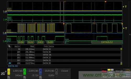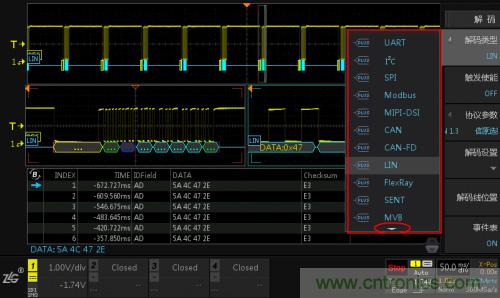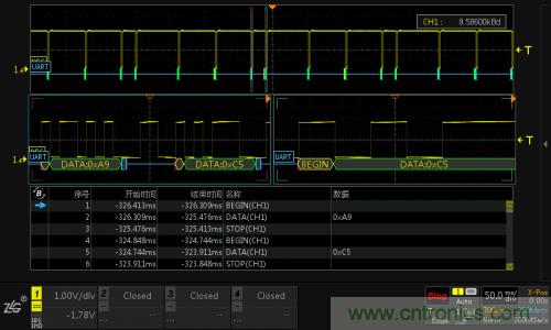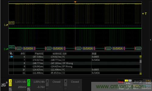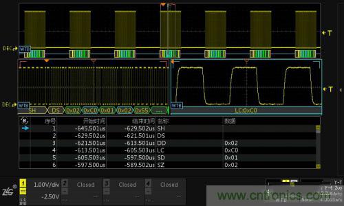 ZDS4000系列示波器免費(fèi)標(biāo)配以上30余種協(xié)議解碼,支持解碼以“十進(jìn)制”,“十六進(jìn)制”,“字符”三種方式顯示,如圖9、10所示。