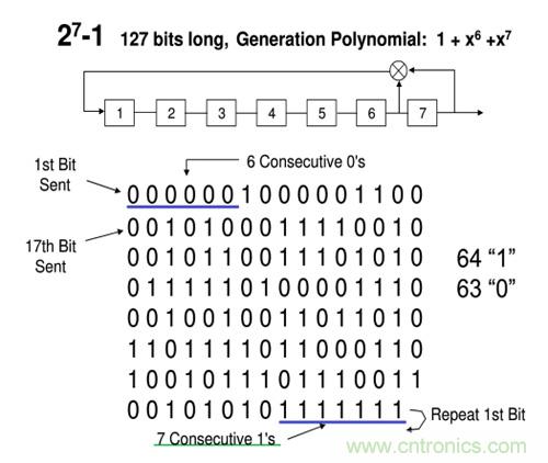 在圖一中可以看到,PRBS7最長(zhǎng)是127bit(27-1), 理論上來說,7bit的2進(jìn)制碼,一共會(huì)有27個(gè)不同組合,但是,如果碼流全部為‘0’的時(shí)候,經(jīng)過異或運(yùn)算,輸入到寄存器第一位的值還是0, 這樣移位寄存器將會(huì)一直輸出為零,移位寄存器被死鎖。所以PRBS碼流不能全部為零。另外,PRBS7 碼流中最長(zhǎng)的連續(xù)‘1’個(gè)數(shù)為7個(gè),最長(zhǎng)的連續(xù)‘0’個(gè)數(shù)為6個(gè)。127bit的連續(xù)碼流中,一共有64個(gè)‘1’,63個(gè)‘0’。
