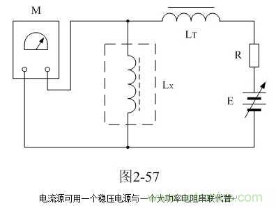 這里順便說明,采用圖2-54測試時應該注意的地方。圖2-54中,隔離電感LT的大小要求是測試電感Lx數(shù)值的3倍以上,并且測量高壓包初級線圈的初始電感值L0時,最好也要接入電路之中。這里,隔離電感LT可選取20毫亨以上的帶矽鋼片鐵芯的電感,電感的鐵芯要留有一定的氣隙;電流源可用一個穩(wěn)壓電源與一個大功率電阻串聯(lián)代替,如圖2-57;或用一個穩(wěn)壓電源與一個大功率晶體放大器串聯(lián)來代替,如圖2-58。