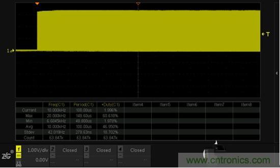 ZDS4000系列示波器不僅僅可以分析占空比趨勢,還可以分析周期和頻率變化趨勢,結合強大的測量功能。