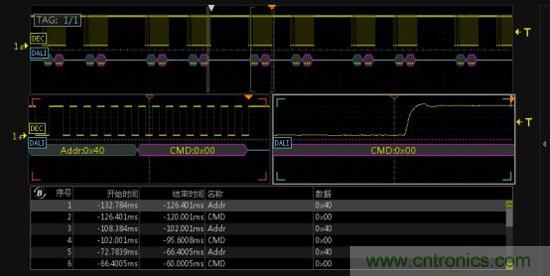 對長時間監(jiān)測的數(shù)據(jù)進行異常分析,可在示波器的縮放模式下使用雙ZOOM多窗口顯示的功能,對信號進行多窗口異常監(jiān)測和分析,可同時對任一數(shù)據(jù)幀和數(shù)椐幀上升沿或下降沿細節(jié)進行分析,然后通過查看放大數(shù)椐細節(jié),事件表中的數(shù)據(jù)和波形一一對應(yīng),定位異常非常方便,如下圖7所示。