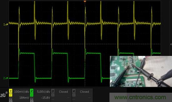 圖3.CH1使用夾子測(cè)量電源輸出,CH2使用夾子測(cè)量電感,單點(diǎn)接地