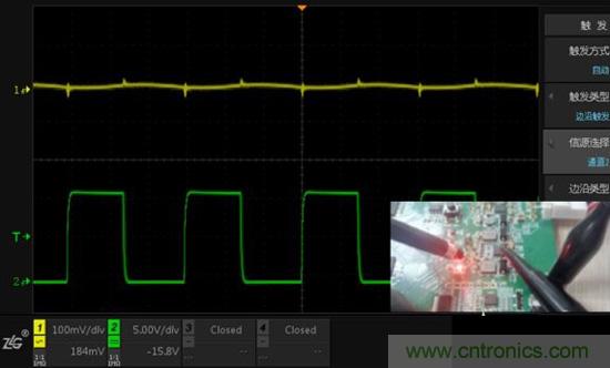 測(cè)試方法:通道1測(cè)量小信號(hào)(100mv/div),通道2測(cè)量大信號(hào)(5V/div),觀察信號(hào)互相影響的情況。