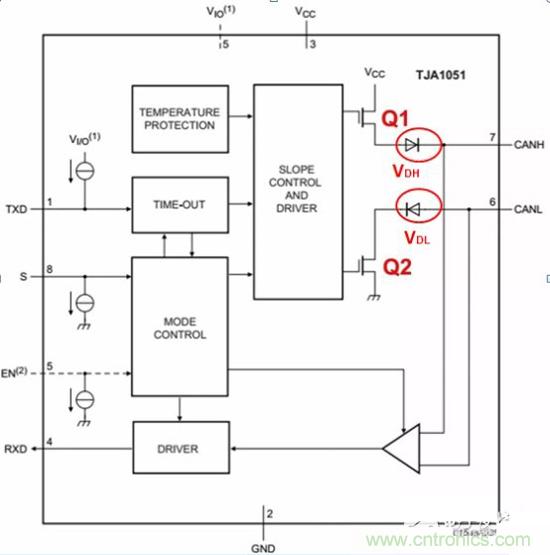 總線顯性時(shí)(邏輯為0),收發(fā)器內(nèi)部Q1、Q2導(dǎo)通,CANH、CANL之間產(chǎn)生壓差;隱性時(shí)(邏輯為1),Q1、Q2截止,CANH、CANL處于無(wú)源狀態(tài),壓差為0。