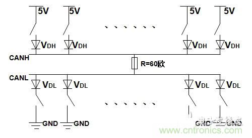 按照標(biāo)準(zhǔn),在總線輸出為顯性時(shí),CANH=3.5V,CANL=1.5V,差分分電平:CANH-CANL=2V,總線網(wǎng)絡(luò)電阻為60歐,流經(jīng)終端電阻的電流約為33mA(2V/60歐);