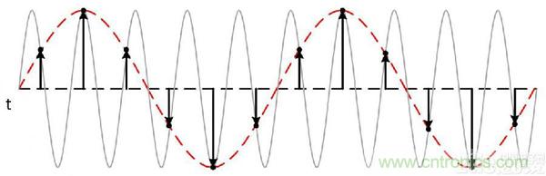當(dāng)采樣過程不滿足Nyquist(奈奎斯特)采樣定理,就可以考慮使用另一種采集方法--等效采樣。等效采樣的基本原理是把高頻、快速信號變成低頻、慢速重復(fù)信號進(jìn)行采集。為了達(dá)到低速采樣還原高頻信號的目的,要求被測信號一定是周期變化的,如果將每個(gè)采樣點(diǎn)安排在不同信號周期內(nèi),取自波形不同的位置上,而不是在同一個(gè)周期的話,就可以大大降低采樣頻率。最后通過數(shù)學(xué)方法再將多個(gè)周期內(nèi)的采樣點(diǎn)還原到一個(gè)周期內(nèi),重構(gòu)被測信號。