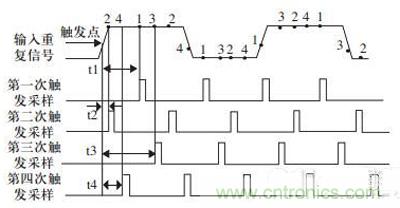 等效采樣有可以分為順序等效采樣和隨機(jī)等效采樣。順序等效采樣是在間隔K個(gè)周期捕獲一個(gè)樣值,每經(jīng)過k個(gè)周期再經(jīng)過一個(gè)微小的延時(shí)△t就獲得一個(gè)樣值。假設(shè)k=1時(shí),每周期采樣N個(gè)點(diǎn)的等效采樣和重構(gòu)過程。最后將采集的數(shù)據(jù)拼湊到一個(gè)周期內(nèi),實(shí)現(xiàn)對原始輸入信號波形的重構(gòu)。重構(gòu)后的采樣頻率變?yōu)槲⑿⊙訒r(shí)△t的倒數(shù)。通過控制這個(gè)△t的大小,就可以控制等效采樣的頻率。實(shí)際采樣頻率可以通過控制K的大小進(jìn)行調(diào)節(jié)。K越大,實(shí)際采樣頻率越??;而△t越小,等效采樣頻率越高。這樣就實(shí)現(xiàn)了低速采樣高頻信號的目的。