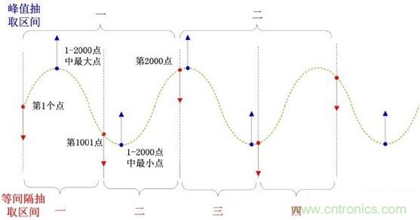 峰值抽取是采樣點(diǎn)有 2M,顯示點(diǎn)數(shù) 2k,實(shí)際顯示是 2k 個(gè)點(diǎn)抽取兩個(gè),0~2000 點(diǎn)之間找最大和最小值,然后是 2001~4000 之間找最大和最小值,以此類推,重新構(gòu)建波形。如下圖: