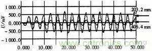 由于頻率的提高,傳輸線之間的串?dāng)_明顯增大,對信號完整性也有很大的影響,可以通過仿真來預(yù)測、模擬,并采取措施加以改善。以CMOS信號為例建立仿真模型,如圖6所示。在仿真時設(shè)置干擾信號的頻率為66MHz的方波,被干擾者設(shè)置為零電平輸入,通過調(diào)整兩根線的間距和兩線之間平行走線的長度來觀察被干擾者接收端的波形。仿真結(jié)果如圖7,分別為間距是203.2mm、406。4mm時的波形。
