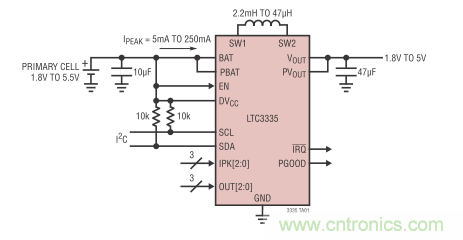 LTC3335 是一款毫微功率高效率同步降壓-升壓型轉(zhuǎn)換器,內(nèi)置了精確的庫倫計(jì)數(shù)器,提供高達(dá) 50mA 連續(xù)輸出電流。該器件具僅為 680nA 的靜態(tài)電流,可編程峰值輸入電流從低至 5mA 直至 250mA,非常適合多種低功率電池應(yīng)用,例如在可穿戴設(shè)備和 IoT 設(shè)備中見到的那些應(yīng)用。其 1.8V 至 5.5V 輸入電壓范圍和 8 個(gè) 1.8V 至 5V 的用戶可選輸出允許在輸入電壓高于、低于或等于輸出電壓時(shí),提供穩(wěn)定的輸出電源。此外,該器件集成的精確 (±5% 電池放電測量準(zhǔn)確度) 庫倫計(jì)數(shù)器可在長壽命不可再充電的電池供電應(yīng)用中,對(duì)累積電池放電提供準(zhǔn)確監(jiān)視,這類應(yīng)用在很多情況下具極其平坦的電池放電曲線。典型應(yīng)用包括無線傳感器、遠(yuǎn)程監(jiān)視器和ADI的 Dust Networks SmartMesh系統(tǒng)。LTC3335 包含 4 個(gè)內(nèi)部低 RDSON MOSFET,可提供高達(dá) 90% 的效率。其他特點(diǎn)包括一個(gè)可編程放電報(bào)警門限、一個(gè)用于存取庫倫計(jì)數(shù)值和器件設(shè)定的 I2C 接口、一個(gè)電源良好輸出和 8 個(gè) 5mA 至 250mA 的可選峰值輸入電流以適合多種類型和尺寸的電池。采用耐熱增強(qiáng)型 20 引線 3mm x 4mm QFN 封裝的 LTC3335 的工作結(jié)溫范圍為 -40°C 至 +125°C。圖 2 顯示了 LTC3335 的典型應(yīng)用電路。