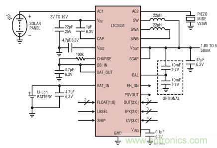 LTC3331 是一款完整的能量收集解決方案,提供高達(dá) 50mA 連續(xù)輸出電流,當(dāng)可收集能量可用時(shí)能延長電池壽命。簡便的 10mA 分流器用收集的能量給可充電電池充電,同時(shí)低電池電量斷接功能保護(hù)電池免于深度放電。當(dāng)用收集的能量向負(fù)載提供穩(wěn)定功率時(shí),該器件僅需要電池提供 200nA 電源電流,當(dāng)在無負(fù)載情況下由電池供電時(shí),僅需要 950nA 工作電流。LTC3331 集成了一個(gè)高壓能量收集電源、一個(gè)電池充電器和一個(gè)同步降壓-升壓型 DC/DC 轉(zhuǎn)換器,可為能量收集應(yīng)用提供一個(gè)持續(xù)穩(wěn)定的輸出,例如無線傳感器網(wǎng)絡(luò)中的能量收集應(yīng)用。能量收集電源由適合 AC 或 DC 輸入的全波橋式整流器和高效率降壓型轉(zhuǎn)換器組成,從壓電 (AC)、太陽能 (DC)、或磁性 (AC) 能源收集能量。當(dāng)沒有收集能量可用時(shí),可充電電池輸入給降壓-升壓型轉(zhuǎn)換器供電,該轉(zhuǎn)換器在直至 4.2V 的整個(gè)電池電壓范圍內(nèi)運(yùn)行,無論輸入高于、低于或等于輸出,都可調(diào)節(jié)輸出。當(dāng)收集能源不再可用時(shí),LTC3331 自動(dòng)轉(zhuǎn)換至電池。LTC3331 的能量收集輸入在 3V 至 19V AC 或 DC 電壓范圍內(nèi)運(yùn)行,從而使該器件非常適合多種壓電、太陽能或磁性能源。其輸入欠壓閉鎖門限設(shè)定是可編程的,范圍為 3V 至 18V,從而使應(yīng)用能夠在峰值功率傳送點(diǎn)上運(yùn)行能量收集電源。其他特點(diǎn)包括引腳可編程輸出電壓和降壓-升壓峰值電流限制、一個(gè)超級(jí)電容器平衡器和一個(gè)輸入保護(hù)性分路器。LTC3331 采用耐熱增強(qiáng)型 5mm x 5mm QFN 封裝。圖 3 顯示了 LTC3331 的典型應(yīng)用電路。