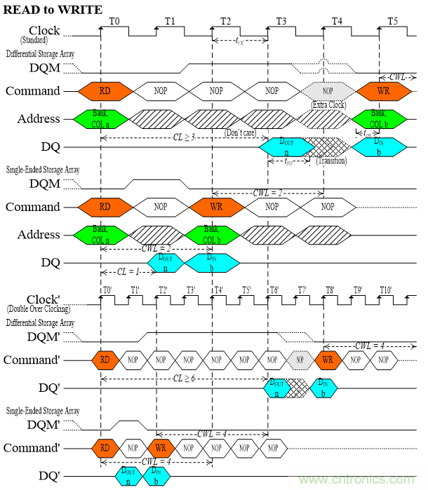 圖4用于觀察SDRAM的命令序列對于不同存取技術(shù)所發(fā)生的變化,此圖用于比較第二代與第三代技術(shù)之間的存取效率。SDRAM的命令序列有多種組合,其中讀取命令至寫入命令(READ to WRITE)最能突顯不同存取技術(shù)之間的差異。第三代技術(shù)的讀取時間(tread)很短,于是CL值可以很小,但受到差動頻率信號以及DQM信號的限制而不能等于0;另外,即使CL值等于1也還有回寫時間(trewrite),所以第三代技術(shù)要以CWL值來替換CL值。