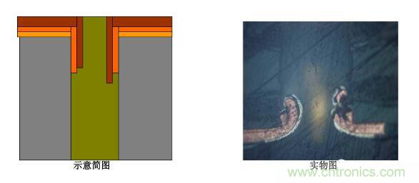 4. 塞孔無銅:圖電蝕刻后,有明顯的物質(zhì)卡塞在孔中,大部分孔壁被蝕掉,斷口處圖電層未將板電層包住。