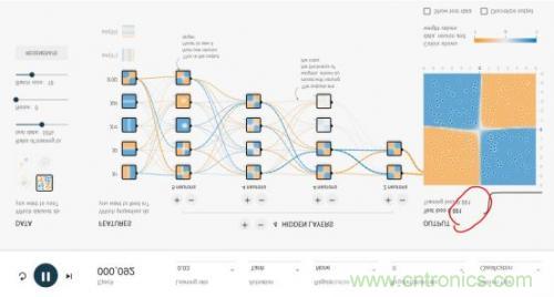 整個(gè)網(wǎng)絡(luò)的輸入層是FEATURES(待解決問(wèn)題的特征),例如x1和x2表示垂直或者水平切分來(lái)劃分藍(lán)色與黃色點(diǎn),這是最容易理解的2種劃分點(diǎn)的方法。其余5種其實(shí)不太容易想到,這也是傳統(tǒng)的專家系統(tǒng)才需要的,實(shí)際上,這個(gè)游樂(lè)場(chǎng)就是為了演示,1、好的神經(jīng)網(wǎng)絡(luò)只用最基本的x1,x2這樣的輸入層FEATURES就可以完美的實(shí)現(xiàn);2、即使有很多種輸入特征,我們其實(shí)并不清楚誰(shuí)的權(quán)重最高,但好的神經(jīng)網(wǎng)絡(luò)會(huì)解決掉這個(gè)問(wèn)題。