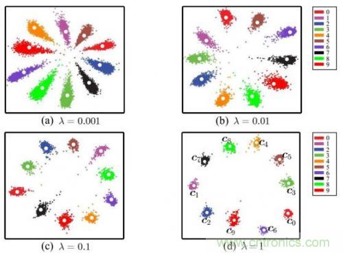 可見(jiàn)效果并不好,中間的樣本距離太近了。通過(guò)centor loss方法處理后,可以把特征值間的距離擴(kuò)大,如下圖所示: