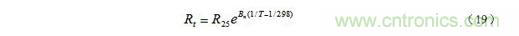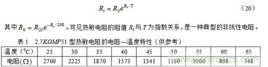 其中R25和Rt分別為25℃和t℃時(shí)熱敏電阻的阻值,T = 273 + t;Bn為材料常數(shù),其值因制作時(shí)不同的處理方法而異,對(duì)確定的熱敏電阻,可以由實(shí)驗(yàn)測(cè)得的電阻—溫度曲線求得。我們也可以把(19)式寫(xiě)成比較簡(jiǎn)單的表達(dá)式