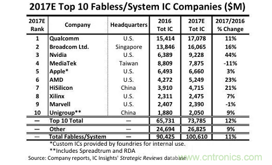 目前看來,紫光展銳現(xiàn)在已經(jīng)是一個擁有4500員工、年營收超過100億元、中國第一、世界第三(僅次于高通和聯(lián)發(fā)科)的芯片設(shè)計公司。在ICinsights最新公布的數(shù)據(jù)里,紫光展銳也是排名世界第九的無晶圓廠,這是國內(nèi)除海思外,唯一入選的企業(yè)。多方面的數(shù)據(jù)證明,紫光展銳已經(jīng)在芯片世界擁有了不小的名頭。