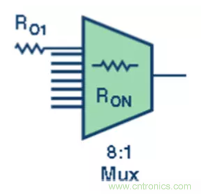 第二級,將放大器的輸出信號施加到多路復用器的 8 個輸入端 (圖3)。每個輸入以一個阻尼電阻 (RO) 進行緩沖,以減少多路復用器通道切換導致的電荷反沖。根據(jù)多路復用器數(shù)據(jù)手冊規(guī)定的技術(shù)規(guī)格,每個通道的內(nèi)部會設(shè)有一些寄生電容或額定 RO。