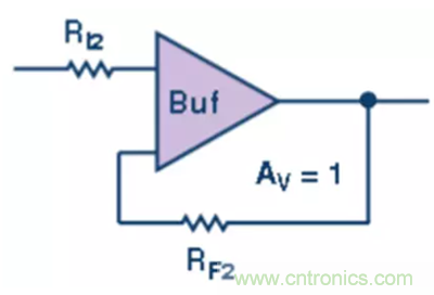 第三級,將結(jié)果形成的通道信號施加到單位增益緩沖級放大器 (圖4)。使用電阻是為了減少輸入偏置電流不平衡。