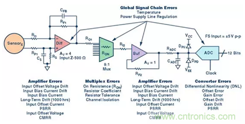 無源和有源器件都會出現(xiàn)多種誤差。并非所有誤差都很重要,但要記住對信號鏈應(yīng)用重要的那些誤差。并非所有誤差對每種應(yīng)用都有效。在進行任何直流精度誤差分析時,決定最重要或者影響最大或權(quán)重最大的誤差有哪些,這是必不可少的步驟。