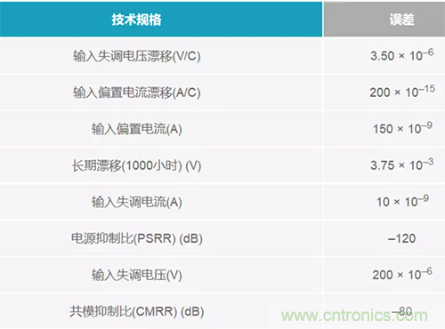 眾所周知,放大器還遠遠沒有達到理想水平。它們有許多誤差,一般都列示于數(shù)據(jù)手冊當中。失調(diào)電壓和偏置電流是兩種常見的誤差,但同時也要考慮任何漂移誤差、長期誤差和隔離誤差(如電源抑制比(PSRR))。表1列出了在使用放大器時應(yīng)考慮的下列誤差。