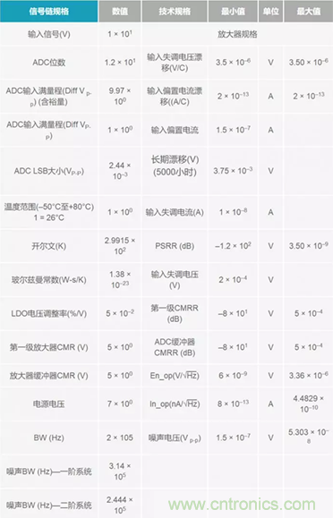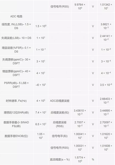 雖然分析信號鏈精度的方法有許多種,但電子表格法卻最為靈活。這種方法還有助于了解如何把所有這些誤差數(shù)據(jù)在信號鏈設(shè)計中進行細分。借助這種方法,設(shè)計人員可以快速而有效地在可以為設(shè)計考慮的合適器件之間做出權(quán)衡。