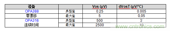表1顯示了連續(xù)時(shí)間和零漂移放大器的Vos和dVos/dT的比較。請(qǐng)注意,零漂移放大器的Vos和dVos/dT要小三個(gè)數(shù)量級(jí)。