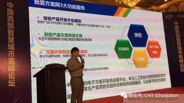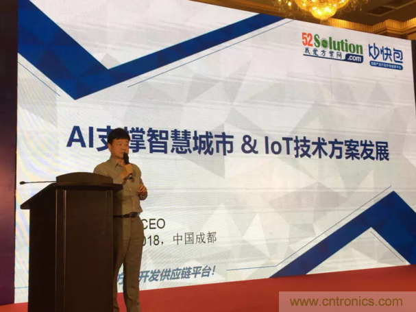 【導(dǎo)讀】為服務(wù)西部產(chǎn)業(yè)創(chuàng)新,中電網(wǎng)絡(luò)技術(shù)/我愛(ài)方案網(wǎng)攜手四川本地技術(shù)服務(wù)商與中國(guó)電子信息博覽會(huì)來(lái)到成都,我愛(ài)方案網(wǎng)的CEO劉杰博士在2018中國(guó)智慧城市高峰論壇做大會(huì)報(bào)告,圍繞“AI支撐智慧城市和IoT技術(shù)方案發(fā)展”做了主題講演。