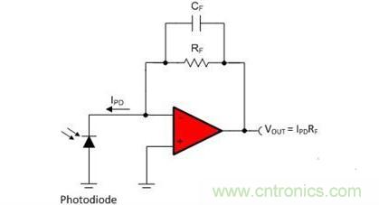 圖1:反饋電容器CF補償光電二極管接觸電容和運算放大器輸入電容