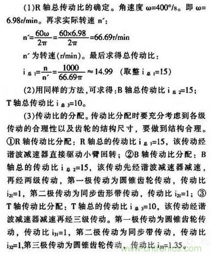 諧波齒輪減速器是一種新型的機械傳動變速機構(gòu)。 與普通齒輪傳動相比,具有體積小,重量輕,結(jié)構(gòu)簡單。它與傳動比相當(dāng)?shù)钠胀p速器比較,其零件減少50%。 體積和重量均減少l,3左右或更多。傳動比范圍大(單級傳動比為40~350,多級傳動比可達1600~100000),傳動效率高(單級傳動效率饑≥85%),傳動精度高。承載能力強等特點。 根據(jù)所選擇的電機,選擇型號為SGMAH—OIA,額定功率為loo W,額定轉(zhuǎn)矩為0.318 N·m,額定轉(zhuǎn)速為 3000 drain的交流伺服電動機。同時選擇XBl諧波減速機,機型為25,減速比為40,輸出力矩為1.0N·m,輸入轉(zhuǎn)速為3000 r/min。為了訂貨和維修方便,三軸均采用同一種減速器。