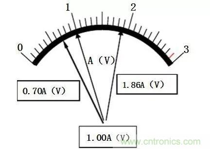 表盤的最小分度值為0.5V/格,雖能準確讀到0.5V,但誤差仍出現在最小分度值的同一數位上,即以V為單位的十分位。其估讀法則是:將最小分度分為五等分,即為0.1V。