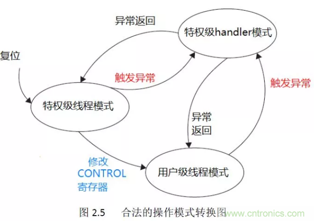 處理器也有兩種特權分級:特權級和用戶級。 這張圖說明了一切:復位進入特權級線程模式,如果有異常,進入特權級的handler模式處理異?;蛑袛嗬?,然后返回至特權級線程模式。通過修改CONTROL寄存器可以進入用戶級線程模式。
